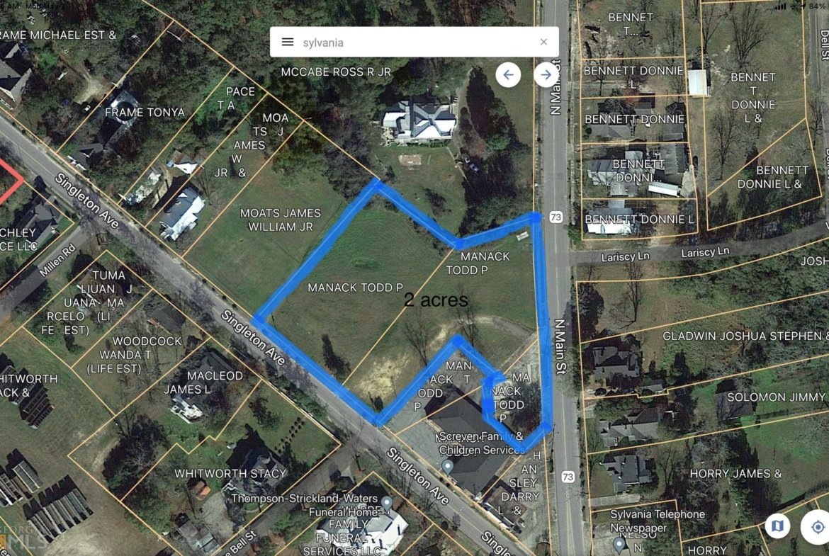 This is a large commercial property located in Downtown Sylvania. Located on North Main Street, aka US HW 301. Also has double street frontage being located on Singleton Ave and North Main. One potential is senior living. Assisted Living, independent cottage style development will be taking this property back to its roots when it was home to Pippin Court. Guest were one block from shopping and dining. Now this property is a new canvas for someone to realized their own dream. According to the housing study performed by the Screven County there is a demand for housing. Downtown’s location would be ideal for the highest density. With 2.01 acres its potential for a meaningful development is great.